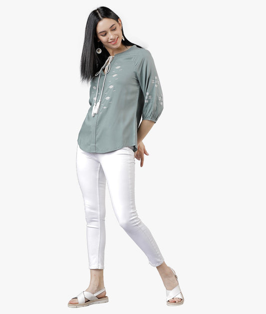 Casual Bishop Sleeve Embroidered Women Grey Top Green