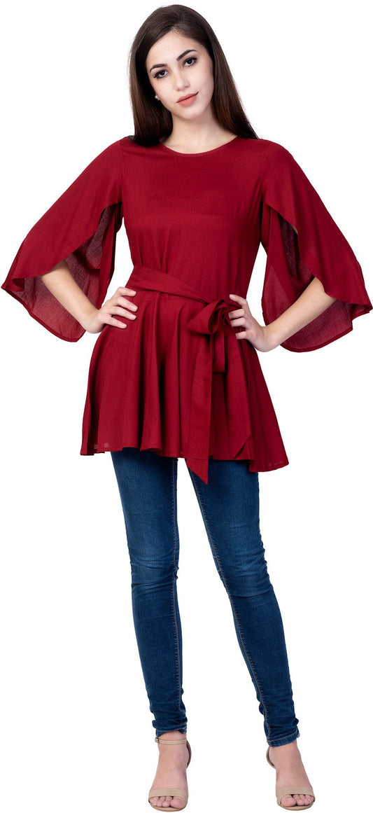 Casual Juliet Sleeve Solid Women Maroon Top MAROON